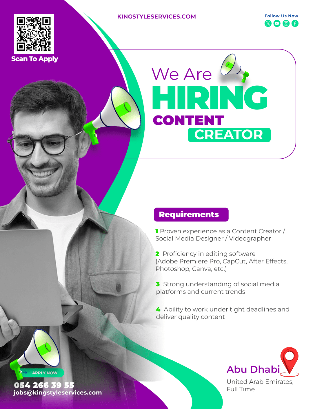 - Proficiency in editing software (Adobe Premiere Pro, CapCut, After Effects, Photoshop, Canva, etc.)